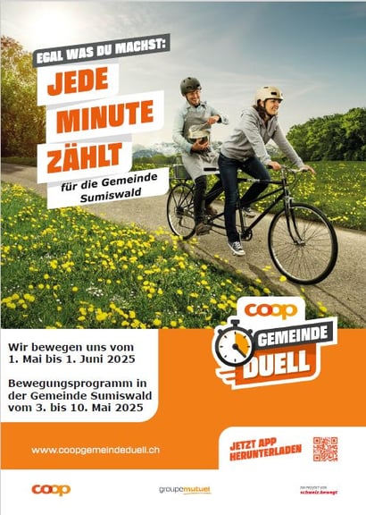 Das «Coop Gemeinde Duell» ist das grösste, nationale Programm zur Förderung von mehr Bewegung in der Schweizer Bevölkerung. Auch die Gemeinde Sumiswald macht mit. Wie es funktioniert und das ganze Programm findest du hier.
