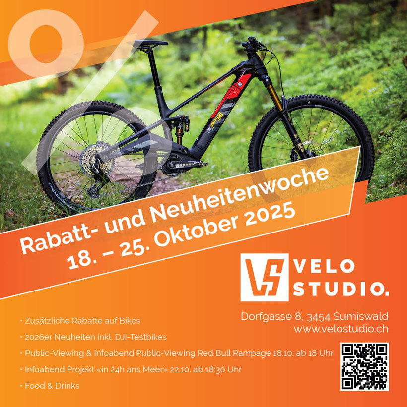 Von Samstag 18. Oktober bis Samstag 25. Oktober findet im VeloStudio die "Rabatt- und Neuheitenwoche" statt. Hier schon mal ein paar der Highlights dieser Woche Zusätzliche Rabatte auf 2024 und 2025er Modelle - einige Modelle sind dann über 50% heruntergesetzt! 2026er Neuheiten inkl. Testbikes mit DJI Motor von Rotwild und Crussis Public Viewing "Red Bull Rampage" am Samstag 18. Oktober - Livestream ab 18 Uhr Infoabend "In 24h von Sumiswald ans Mittelmeer" am Mittwoch, 22. Oktober 18:30 Uhr...